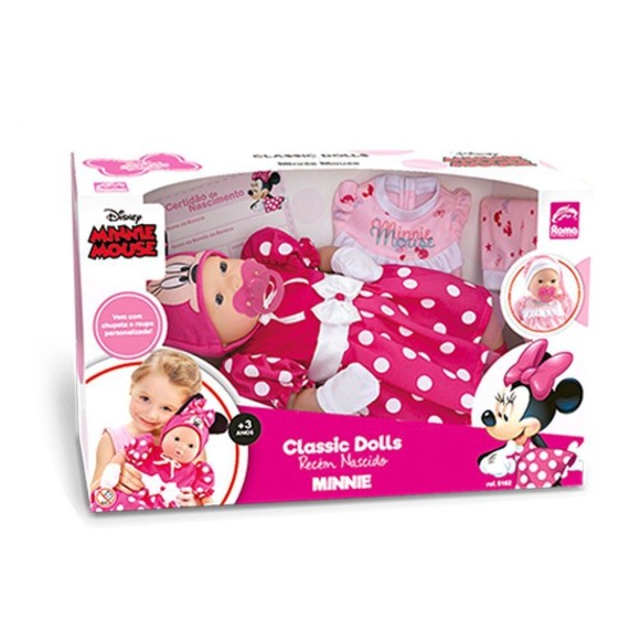 Boneca Minnie Mouse Classic Doll Recém-nascido - Roma Uma linda boneca com roupa personalizada. Vem com pijama, chupeta, além de uma certidão de nascimento para registrar o seu bebê. A primeira de uma super coleção que vai encantar nas brincadeiras durante o dia e também na hora de dormir!
