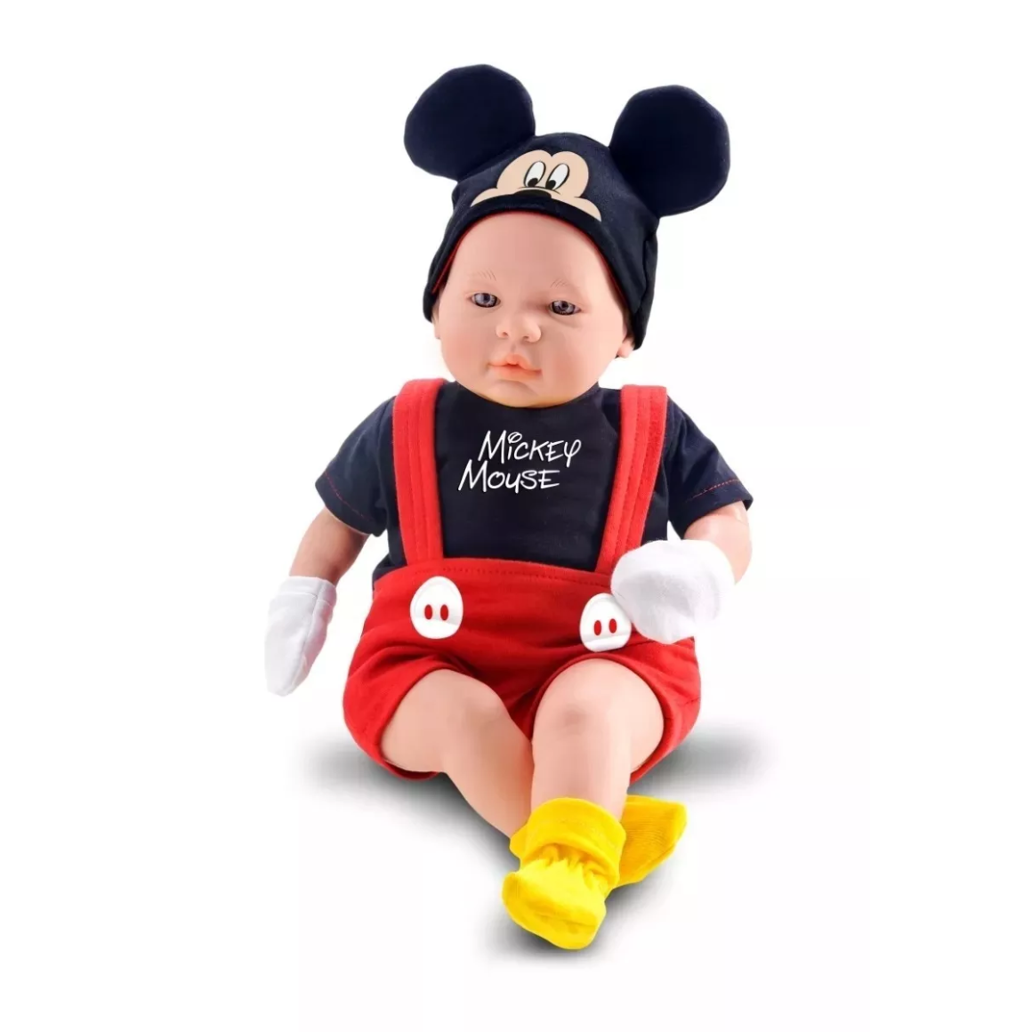 Um lindo boneco com roupa personalizada no rato mais famoso do mundo (Mickey). Vem com pijama, chupeta, além de uma certidão de nascimento para registrar o seu bebê. O primeiro de uma super coleção que vai encantar nas brincadeiras durante o dia e também na hora de dormir!